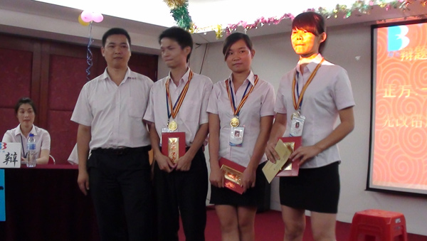 当天大赛的辩题是:在工作当中出现了错误,是先改错后认错,还是先认错后改错?事前作了充分准备的一二组代表作为正方(黄高 、 刘娟  、余伟庞)和三组代表作为反方(覃玉声 、 林静云 、梁珍妮)经过四个比赛阶段(立论陈述、攻辩、自由辩论、总结陈述)为在场每一个人带来了一场精彩的语言盛宴、文化大餐。正方立场是先改错后认错;反方立场是先认错后改错。他们都对各自的立场阐述了独特的见解。台上正反双方观点立场针锋相对, 唇枪舌战,斗智斗勇。整个赛场紧张激烈、精彩纷呈、高清跌起、有声有色,给评委和现场的观众留下了深刻难忘的印象.。经过一番恶战,反方 (覃玉声 、 林静云 、梁珍妮)更能感动观众,征服了评委团从而获得本次“文斗”的获胜奖。最后评委就辩论赛双方表现进行专业到位的评述,对本届辩论大赛起到升华主题,画龙点睛之效。并为双方选手颁奖和合影留念。